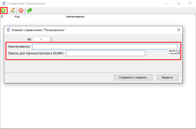 В открывшемся окне необходимо добавить нового пользователя. Далее нужно заполнить поля : "наименование (ФИО)" и придумать пароль (пароль будет использоваться в дальнейшем при работе с сервером) . (Рисунок 2)