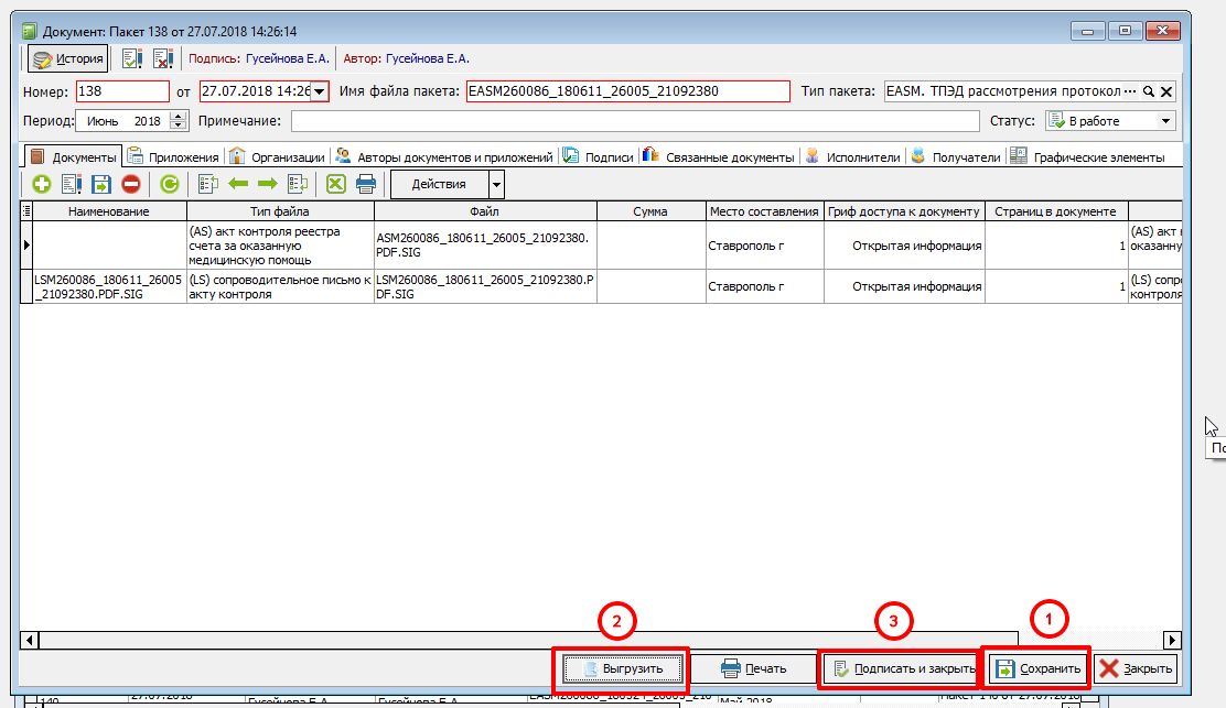 По завершении работы с документом, необходимо нажать "Сохранить", затем "Выгрузить" и "Подписать и закрыть". Рисунок 17.