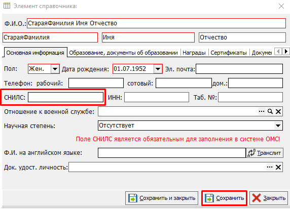 В случае, если врач сменил ФИО, то нужно создавать новую запись работника.
