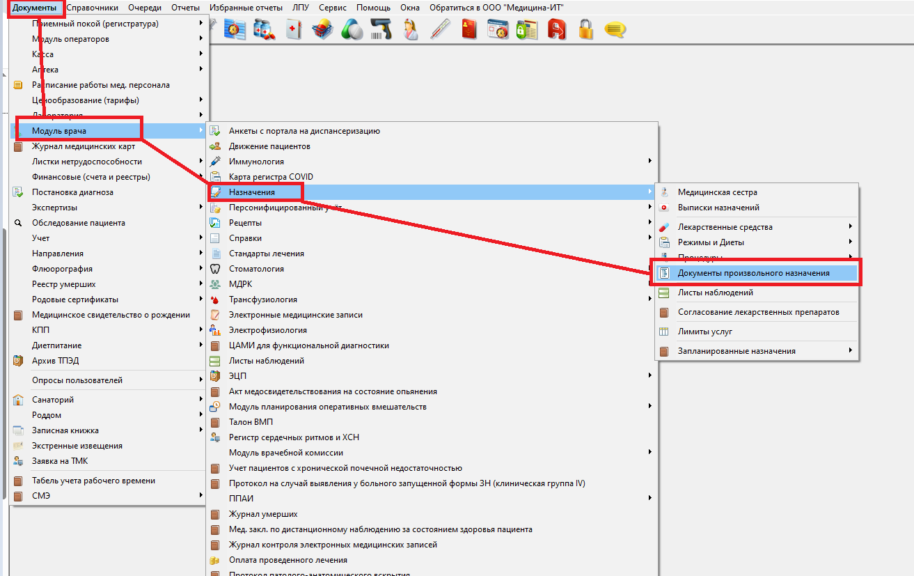 Для просмотра журнала «Документы произвольных назначений» необходимо перейти в пункт меню «Документы» → «Модуль врача» → «Назначения» → «Документы произвольного назначения» (рисунок 2)