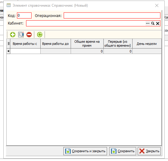 Для добавления нового графика для кабинета, в табличной части "Справочника настройки расписания кабинетов" необходимо нажать на зеленый плюс, откроется новый элемент справочника. необходимо заполнить поля наименование и кабинет. В табличной части элемента, с помощью зеленого плюса добавляем строки с расписанием кабинета . Указывая время работы, общее время приема, перерыв и день недели. Для сохранения и закрытия документа необходимо нажать кнопку "Сохранить и закрыть" (рисунок 3).