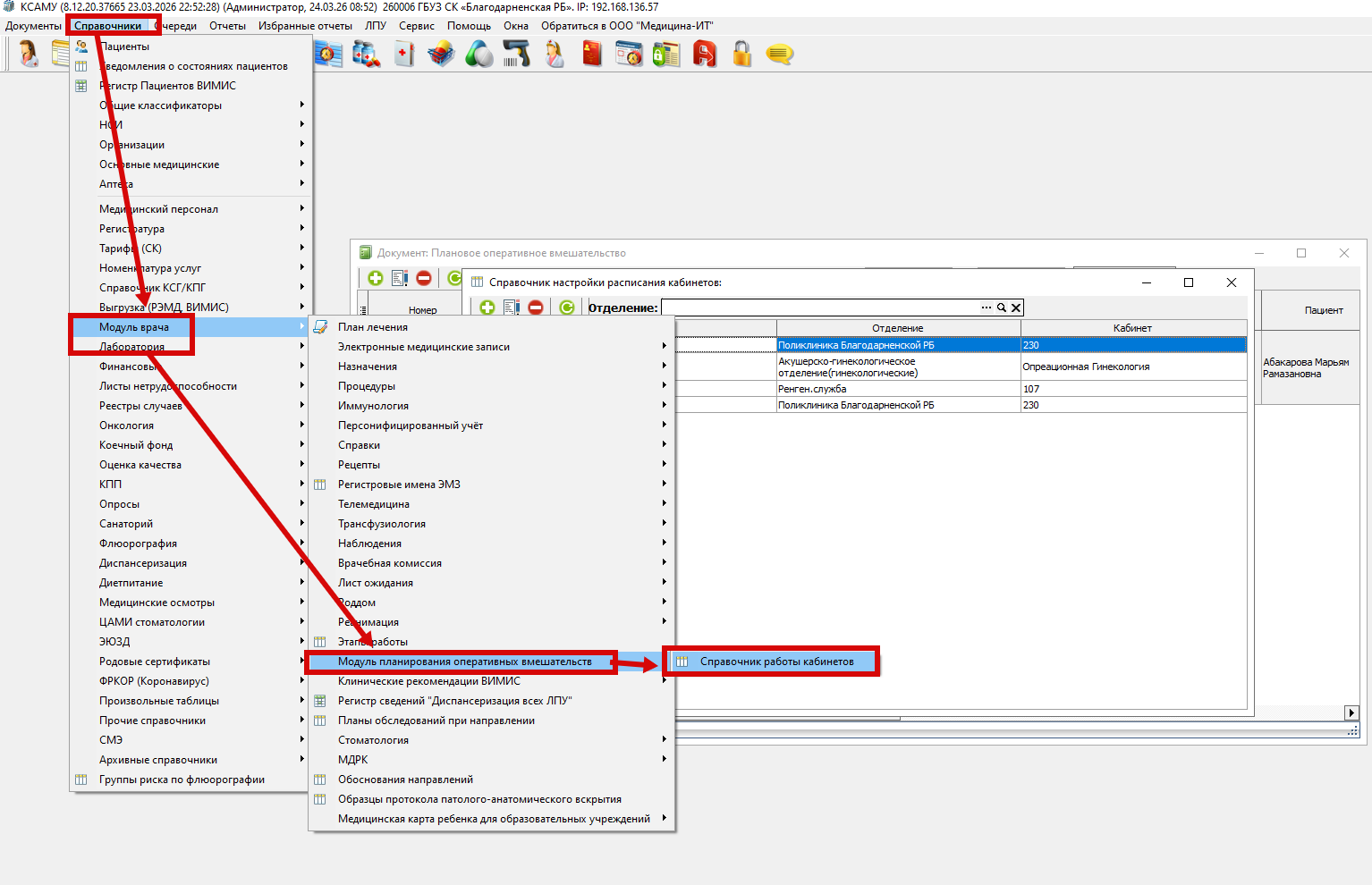Для работы через "Модуль планирования оперативных вмешательств" нужно настроить настроить расписание кабинетов (операционных). Для этого необходимо перейти в «Справочники» → «Модуль врача» → «Модуль планирования оперативных вмешательств» → «Справочник настройки расписания кабинетов» (рисунок 1).