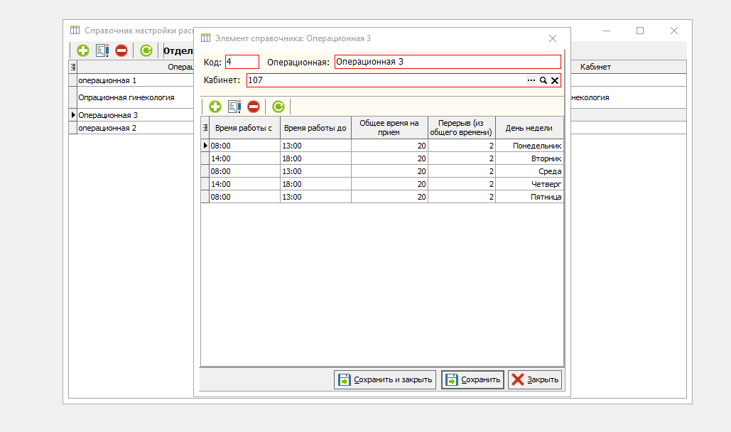 Для добавления нового графика для  кабинета, в табличной части "Справочника настройки расписания кабинетов" необходимо нажать на зеленый плюс, откроется новый элемент справочника. необходимо заполнить поля наименование и кабинет. В табличной части элемента, с помощью зеленого плюса добавляем строки с расписанием кабинета . Указывая время работы, общее время приема, перерыв и день недели. Для сохранения и закрытия  документа необходимо нажать кнопку ""Сохранить и закрыть".(рисунок 3)