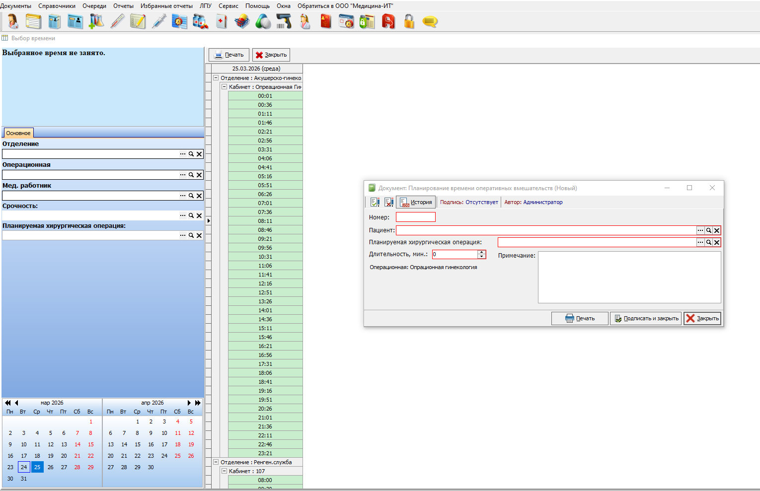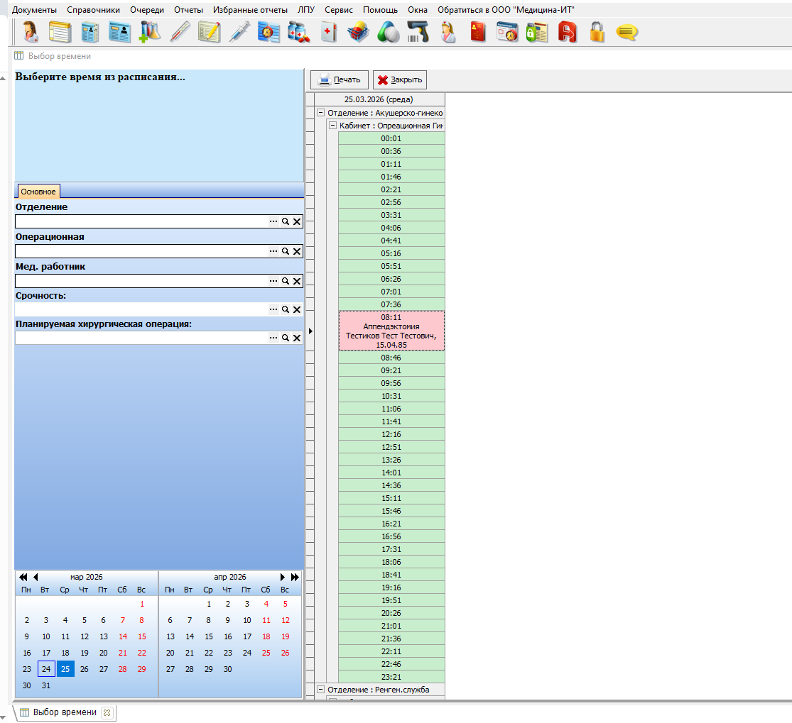 Рисунок 6- Открытие документа планирования времени оперативных вмешательств.
