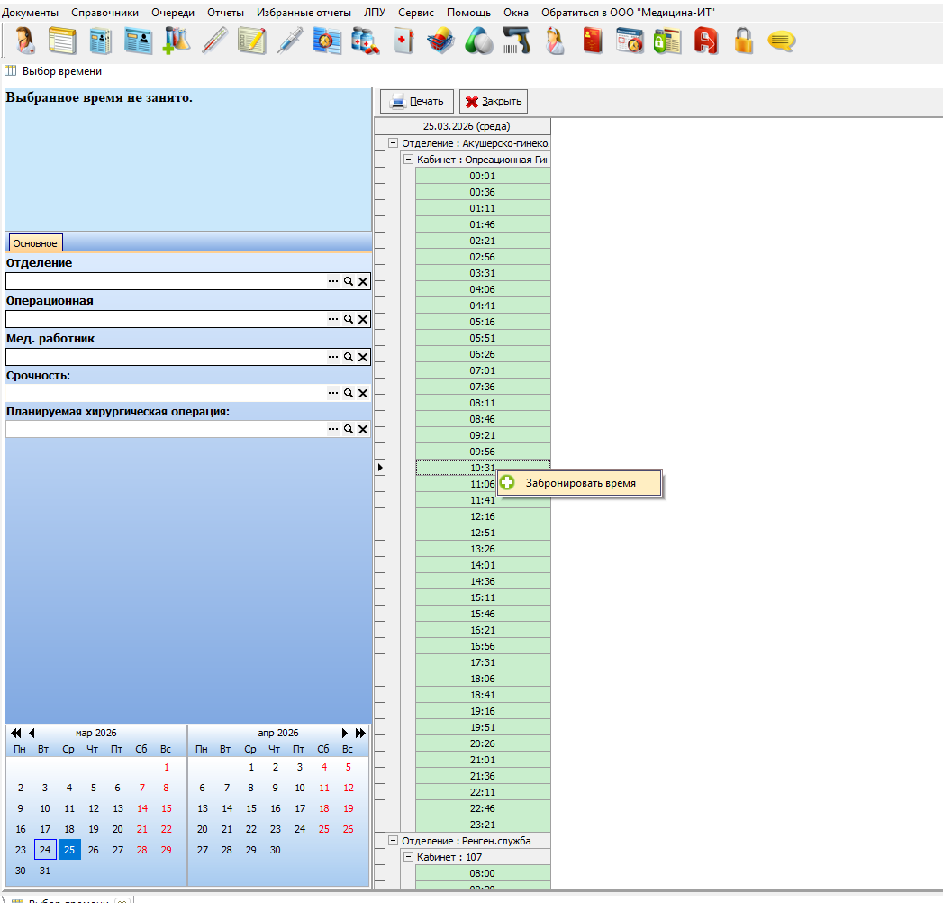 Рисунок 9- Бронирование времени планирования оперативного вмешательства через просмотр загружености кабинетов.