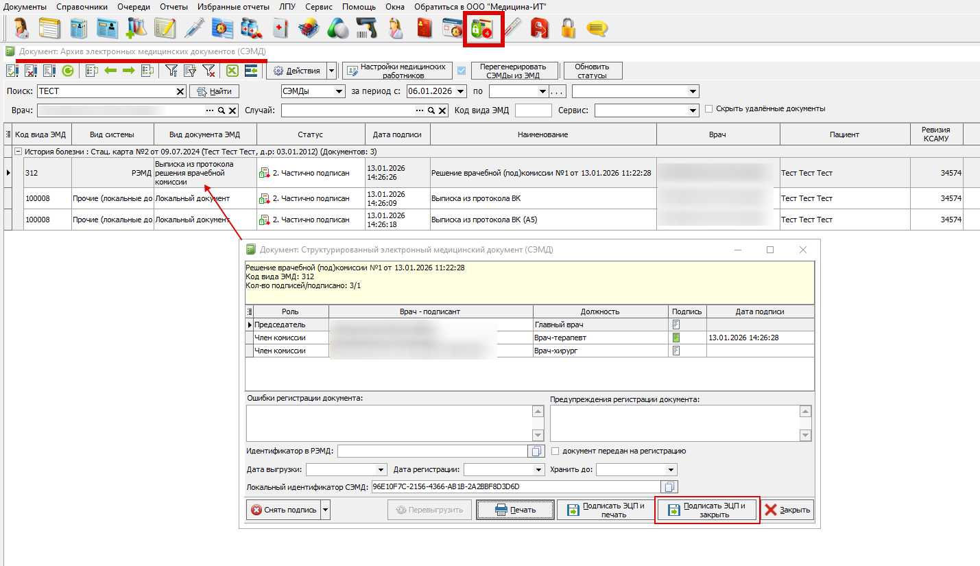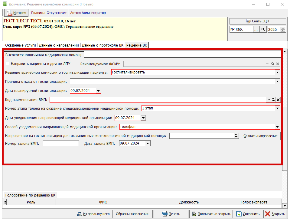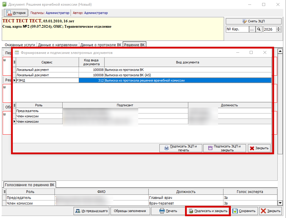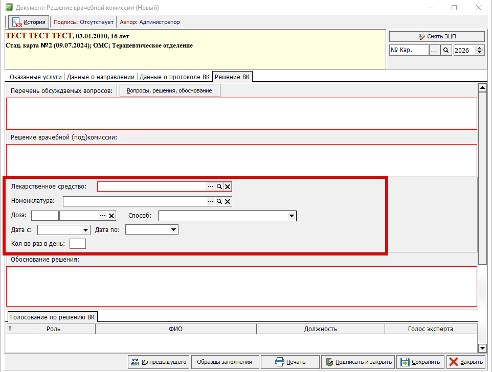 Рекомендация! Не следует заполнять состав комиссии, если поле "Подкомиссия врачебной комиссии" не было заполнено. В противном случаи программ все равно потребует заполнить данное поле, а при его заполнении, подменит состав комиссии на тот который был настроен для выбранной записи. Правильно будет вначале заполнить указанное поле, а уже после, если состав комиссии нужно отредактировать или дополнить - проводить соответствующие действия с таблицей.