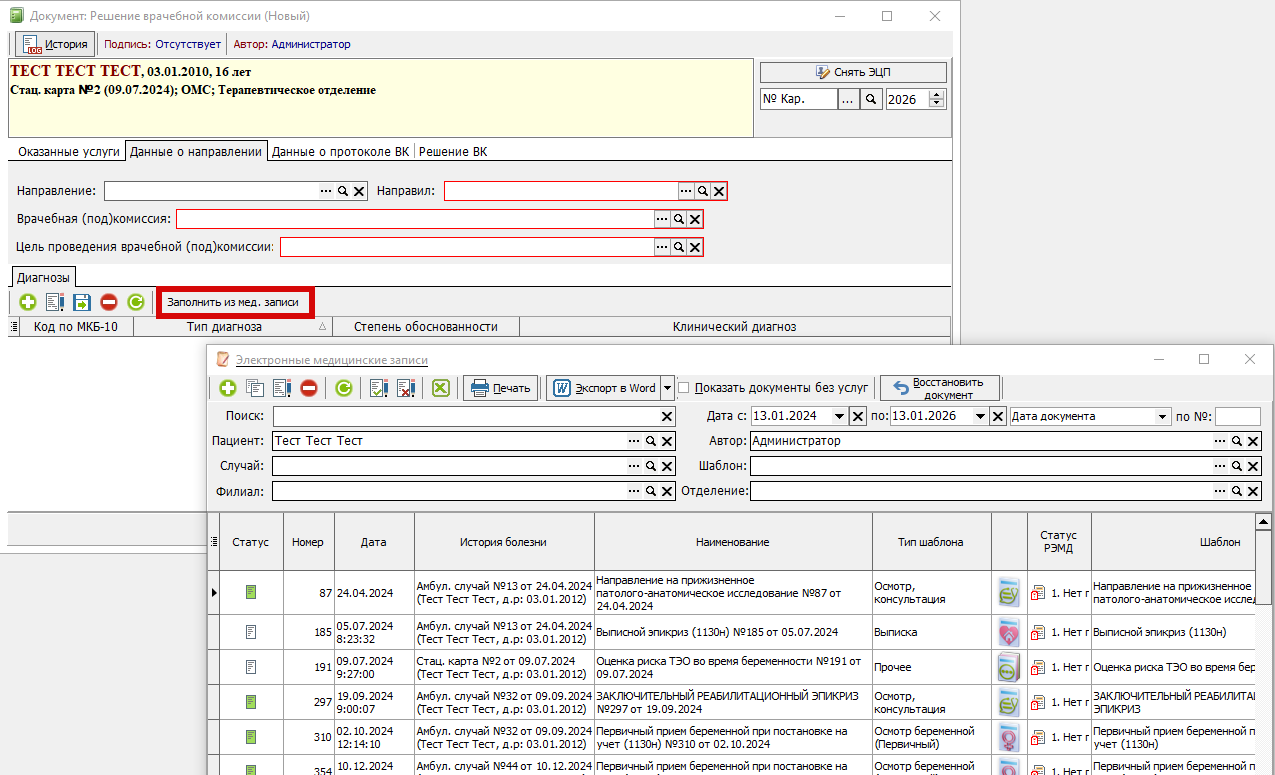 "Диагнозы" - таблица находиться на вкладке "Данные о направлении", заполняется в основном справочной информацией. Для удобства работы диагнозы можно подтянуть из осмотров оформленных на пациента. Для этого необходимо нажать на кнопку "Заполнить из мед. записи" и в открывшемся журнале воспользовавшись фильтрами, выбрать нужный документ (рисунок 2). В случаи если выбранный документ настроен и содержит требуемую информацию, табличная часть заполниться автоматически.