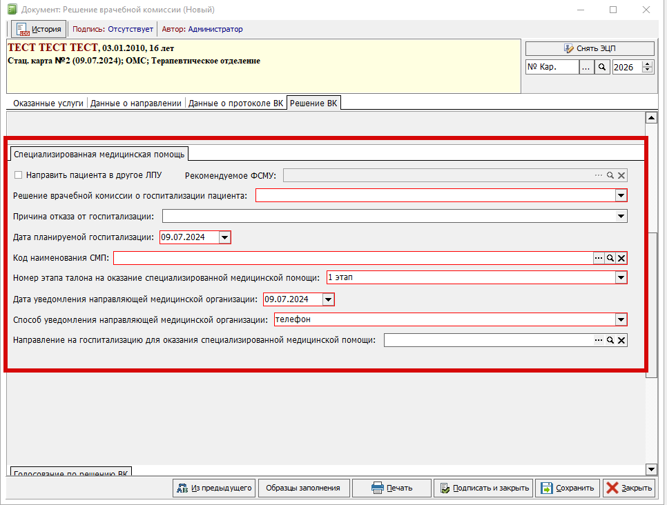 После создания документа направления на ВК, необходимо заполнить обязательные поля: