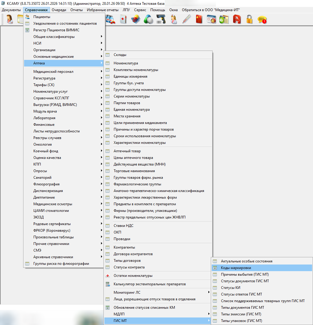 Реестр кодов маркировки ГИС МТ предназначен для осуществления контроля состояния КМ ГИС МТ. Расположен: Справочники - Аптека - ГИС МТ - Коды маркировки (рисунок 1).