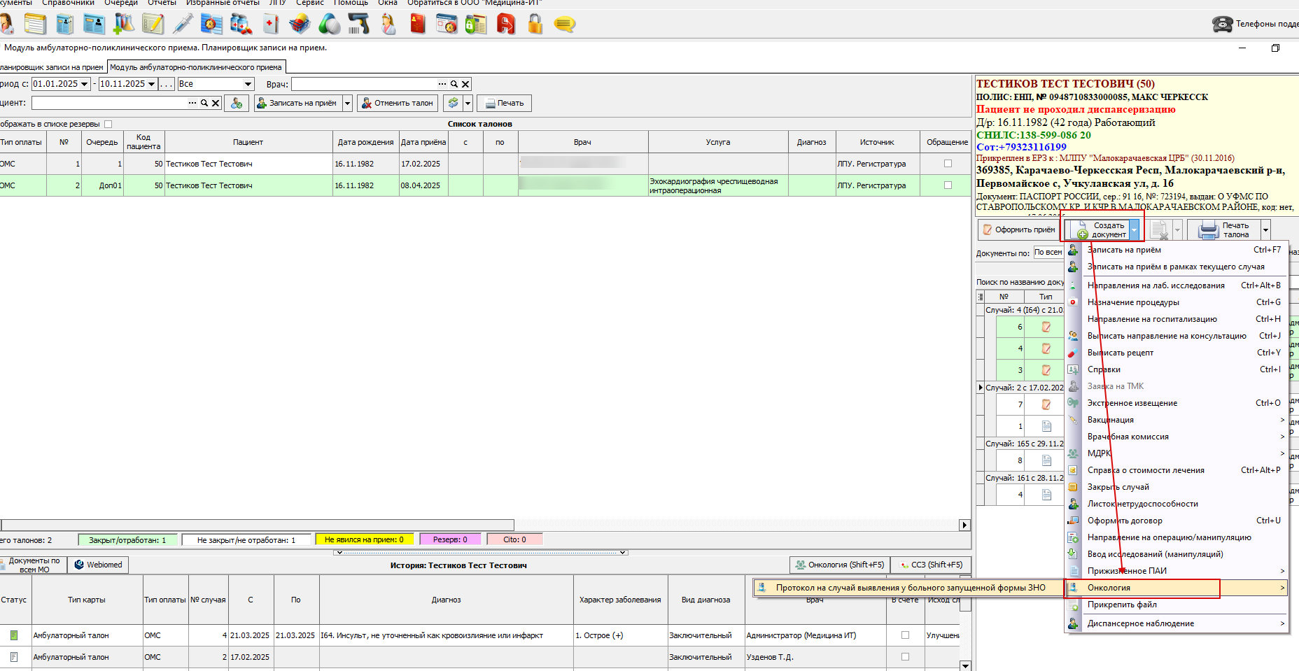 - Окрыть модуль амбулаторно-поликлинического приема, выбрать талон пациента, нажать на кнопку "Создать документ" , в выпадающем списке выбрать раздел "Онкология" , выбрать "Извещение о больном с впервые в жизни установленным диагнозом злокачественного новообразования" (рисунок 2.)