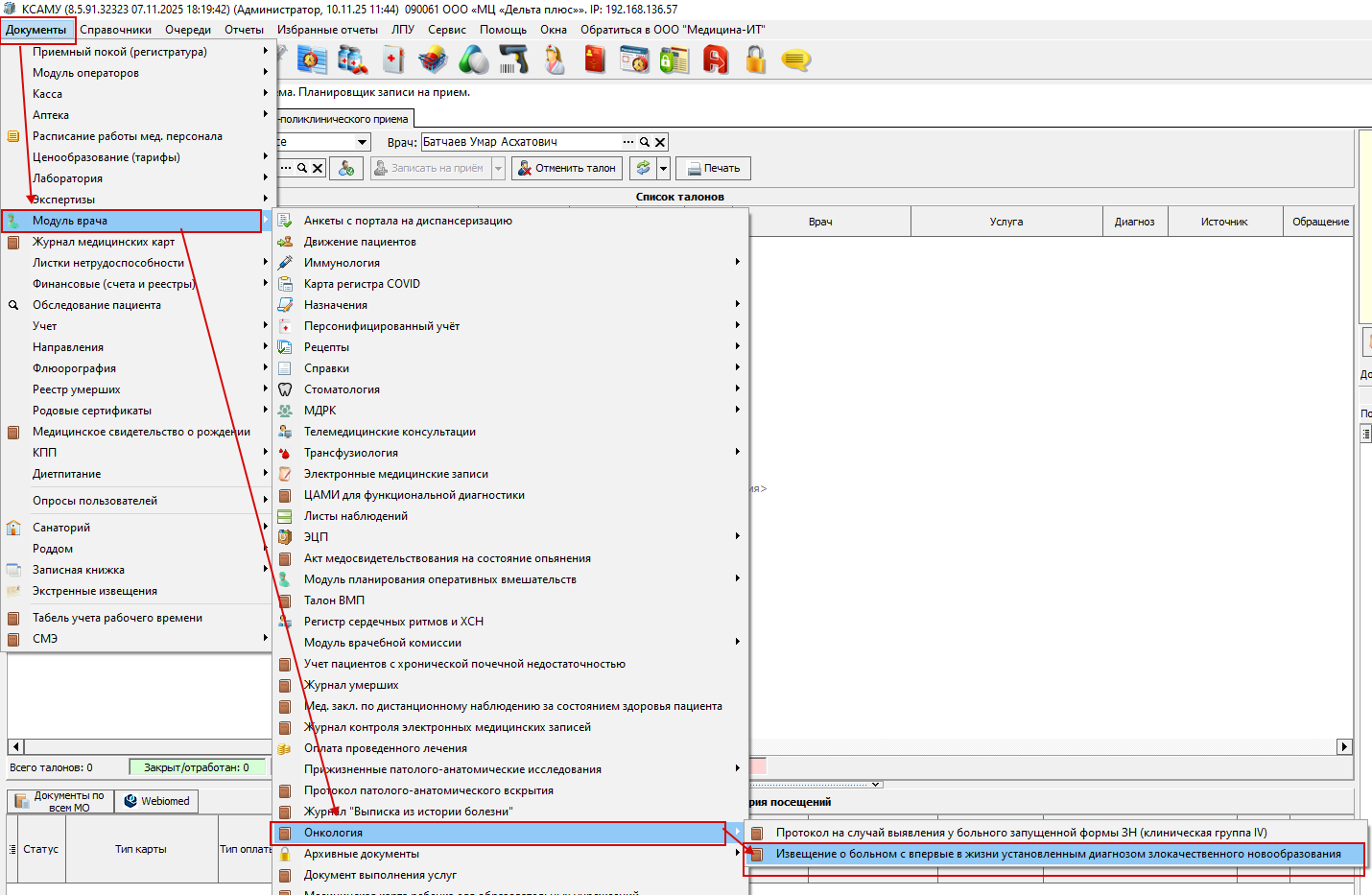 - Открыть пункт меню "Документы-Модуль врача-Онкология-Извещение о больном с впервые в жизни установленным диагнозом злокачественного новообразования" (рисунок 1)