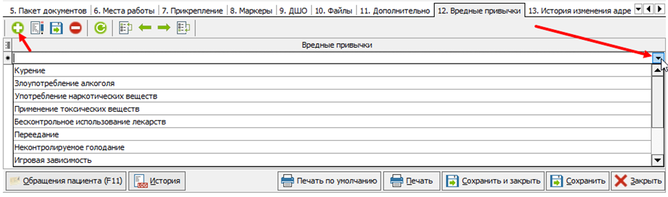 На данной вкладке указываются вредные привычки пациента. с помощью кнопки добавления нового элемента "+" добавляется новая строка и через выпадающий список необходимо указать одну из вредных привычек. Если нужно указать больше, опять же добавляете с помощью кнопки добавления нового элемента "+". (Рисунок 1).