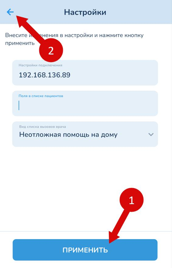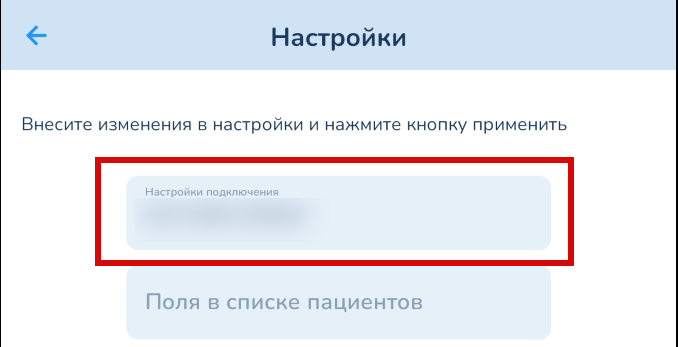 В окне настроек мобильного приложения в поле «Настройки подключения» необходимо указать IP-адрес серверного компьютера, на котором развернута база данных РМИС «КСАМУ» (рисунок 5).