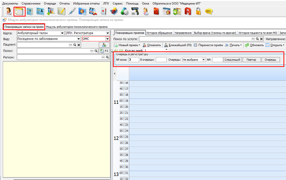 После того как настройки включены у Регистратора (пользователя) в планировщике записи на прием появится интерфейс для работы с электронной регистратурой.