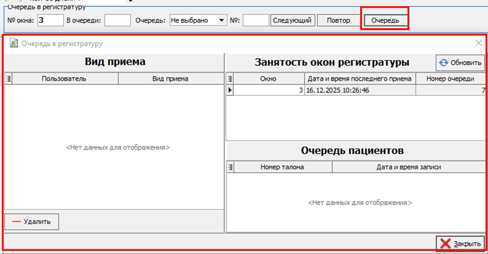 Где будет отображена занятость окон регистратуры, очередь пациентов и вид приема талонов.