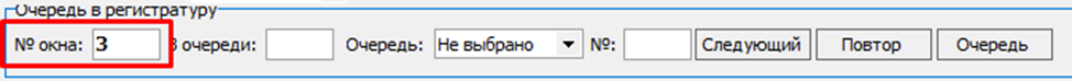 Затем Регистратор (Пользователь) Должен вписать номер окна в регистратуре в котором он будет вести прием.