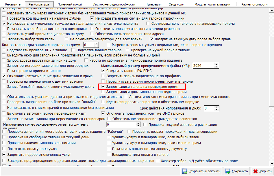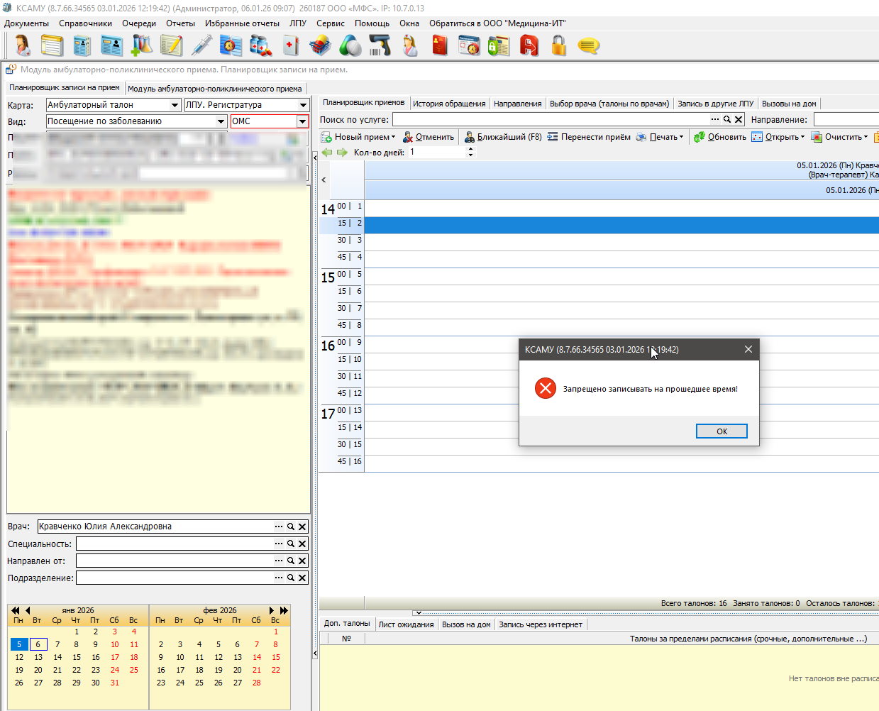 Запрет записи талона на прошедшее время (Рис.1) Настройка "Запрет записи талона на прошедшее время" не дает осуществить запись пациента на прошедшее число. При попытке записать пациента на предыдущий день программа выдаст ошибку (рис.2) и не даст сделать запись.