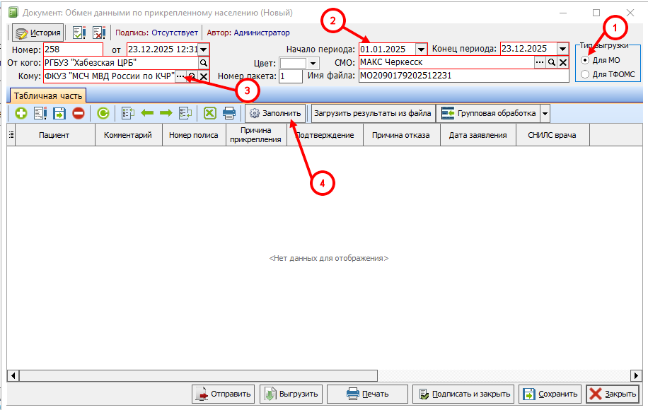 Для заполнения документа по впервые прикрепленным необходимо заполнить следующие поля: 1) Тип выгрузки: МО; 2) Выбрать выгружаемый период; 3) Выбрать МО, по которой будет проходить выгрузка; 4) Нажать кнопку «заполнить».
