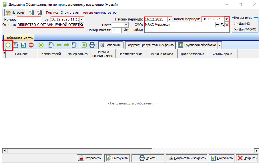 Табличная часть автоматически заполнится пациентами, написавшими заявления о прикреплении к МО в выбранный период, а так же, имеющими актуальный полис выбранной СМО.
