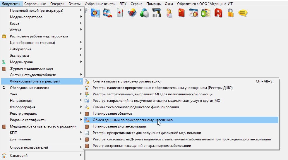 Для запуска модуля обмена данными необходимо выбрать пункт «Документы» – «Финансовые (счета и реестры)» – «Обмен данными по прикрепленному населению» (Рисунок 1):