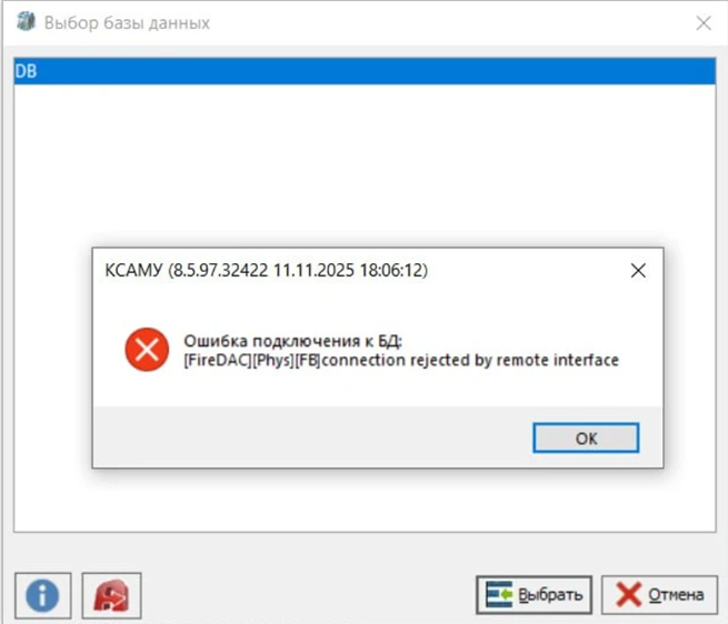 Устранение ошибки «Ошибка подключения к БД: [FireDAC][Phys][FB] connection rejected by remote interface» в КСАМУ