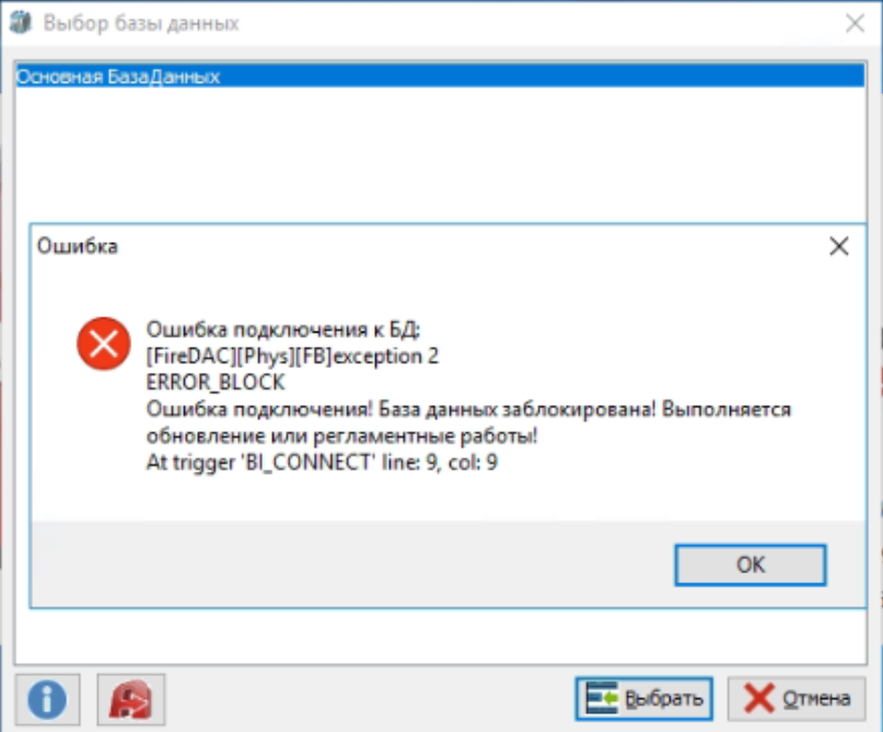 Для устранения ошибки «Ошибка подключения к БД: [FireDAC][Phys][FB]exception 2 ERROR_BLOCK. Ошибка подключения! База данных заблокирована! Выполняется обновление или регламентные работы!» выполните следующие шаги: