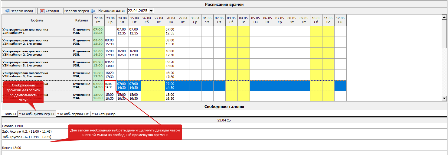 Раздел "Свободные талоны" отображает доступное время для записи по фиксированным слотам времени (рисунок 5) или время для записи по длительности услуги на выбранный день (рисунок 6). В колонках с соответствующей датой приема отображаются наименования видов рабочего времени с различной "подсветкой" цвета, настроенные по виду рабочего времени в меню Справочники - Медицинский персонала - Виды рабочего времени (подробнее о настройках видов рабочего времени).