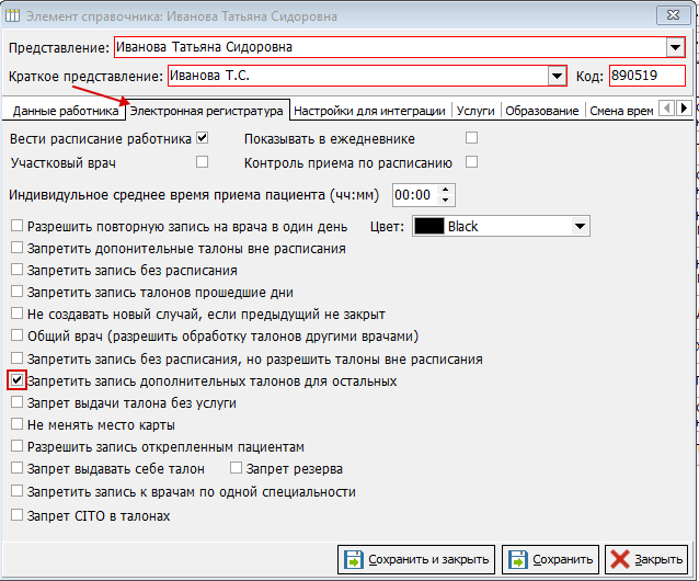 По умолчанию запись настроена таким образом, что записывать пациентов дополнительными талонами можно к любому врачу. Если конкретный врач не принимает пациентов по дополнительным талонам, то можно поставить запрет.