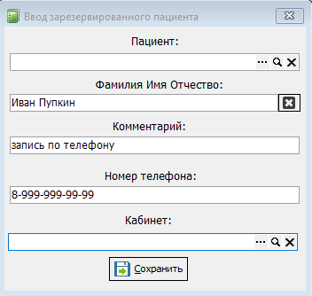 В поле "Пациент:" можно выбрать пациента из справочника по нажатию на кнопку "троеточие", также работает заполнение поля "Кабинет:". Остальные поля заполняются в свободной форме со слов пациента. Для завершения создания резерва необходимо нажать кнопку «Сохранить».