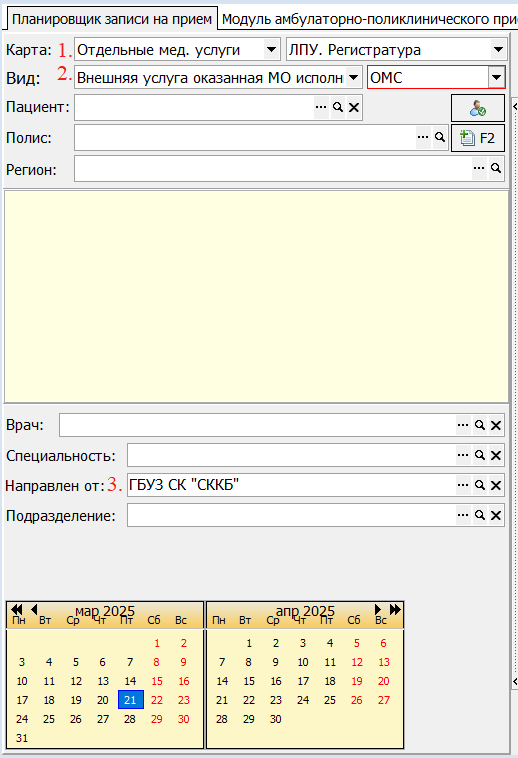 Для записи пациента на прием необходимо зайти в планировщик записи на прием(рисунок 3).