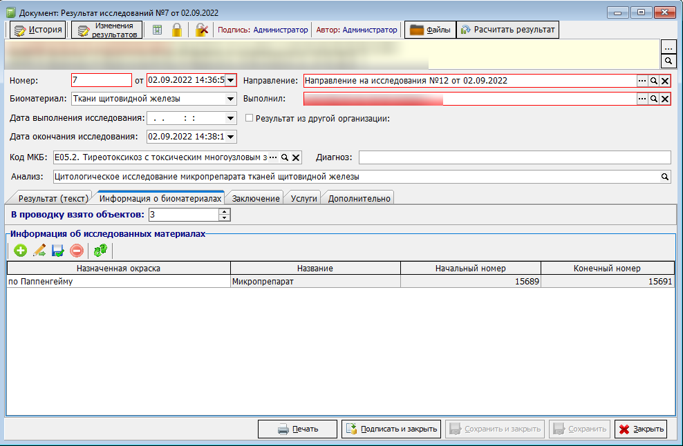 Взятые в работу препараты описываются в табличной части вкладки «Информация о биоматериалах». Номера препаратов присваиваются согласно журналу учёта цитологических препаратов. Группировка номеров приготовленных препаратов указывается согласно окраске.