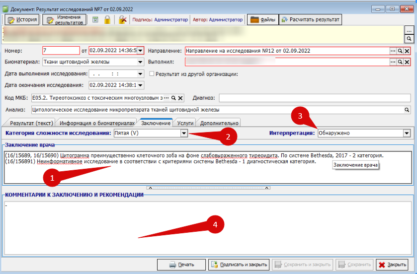 Комментарии к заключению и рекомендации – необязательное для заполнения поле, предоставляется для обратной связи от лаборатории врачу. (Выгружается в внешнюю информационную систему только в случае заполнения) (См. рис. 15 п. 4)