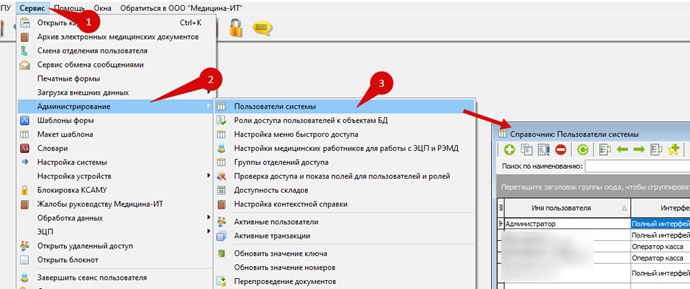 1. Зайти «Сервис» рис.8 п.1, «Администрирование» п.2, «Пользователи системы» п.3;
