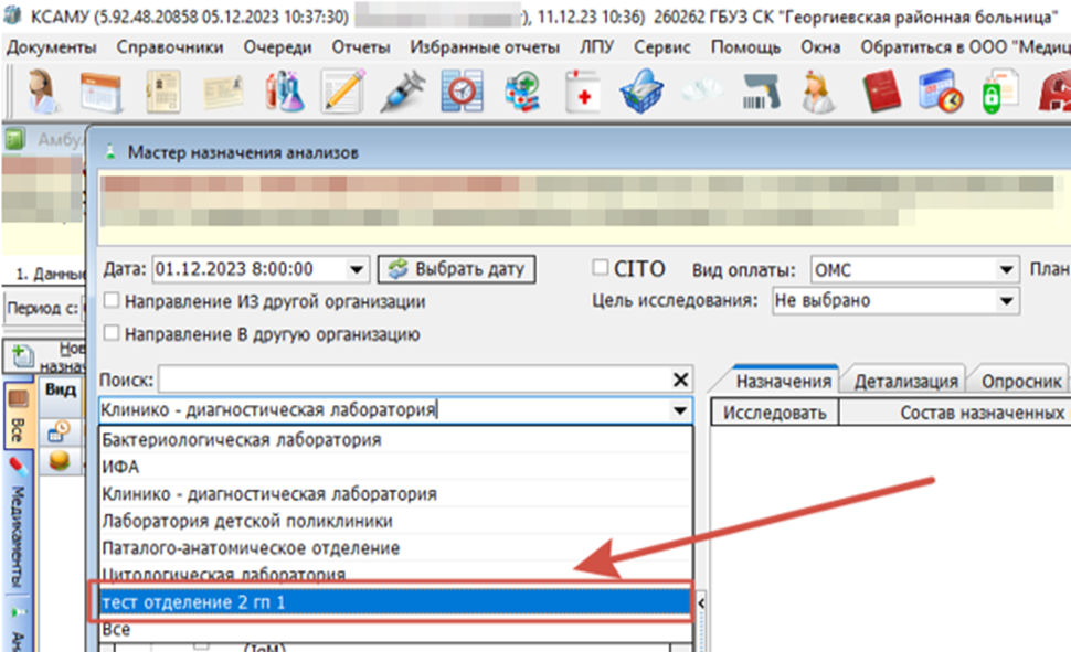 В мастер назначения анализов пользователю №1 показываются все лаборатории, в том числе, у которых указаны филиалы. (рисунок 8)