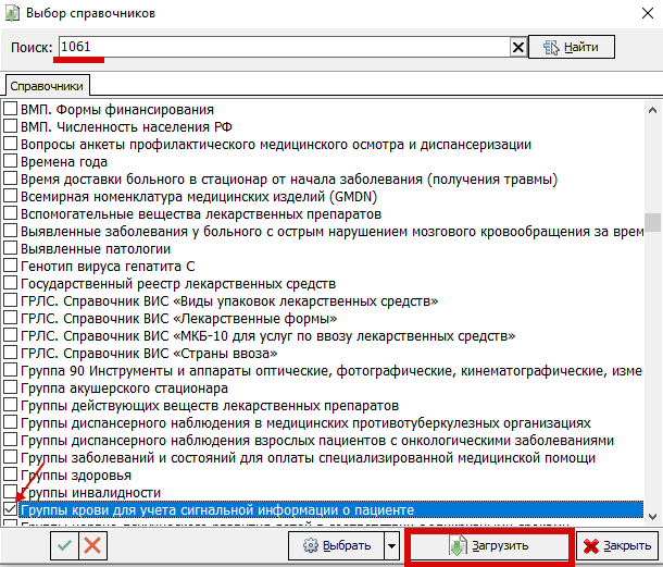 В открывшемся окне введите код 1.2.643.5.1.13.13.11.1061. Для поиска нужного справочника не обязательно вводить код целиком, достаточно последних цифр. Найдите в списке справочников «Группы крови для учета сигнальной информации о пациенте» и поставьте рядом с ним галочку. Нажмите кнопку «Загрузить». (Рисунок 7)