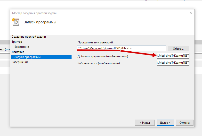 Самое главное в пункте "Запуск программы указать путь до файла vbs: