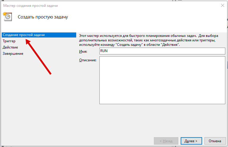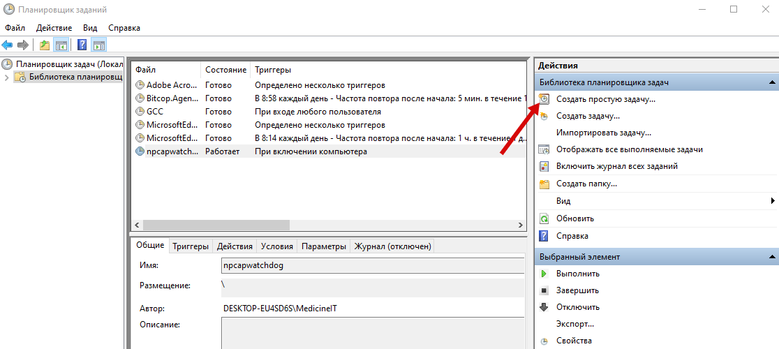Откроется планировщик заданий, в нем нужно создать новую простую задачу: