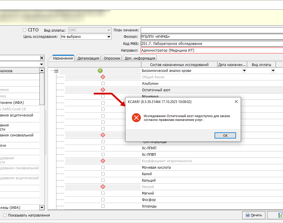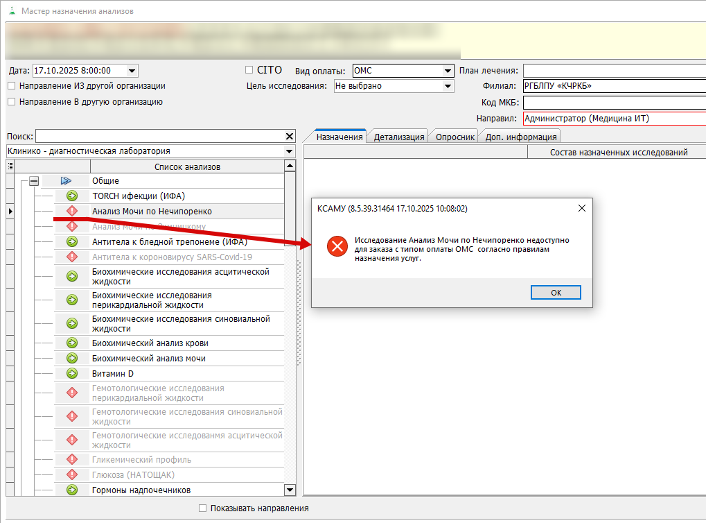 Проверку проходят как анализы (левая часть мастера назначения анализов) (Рис. 3), так и исследования, входящие в состав анализа (правая часть мастера) (Рис. 2).