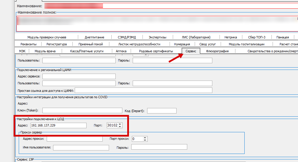 Данные сервера ЦОД можно найти в ЛПУ- Параметры, на вкладке "Сервис"