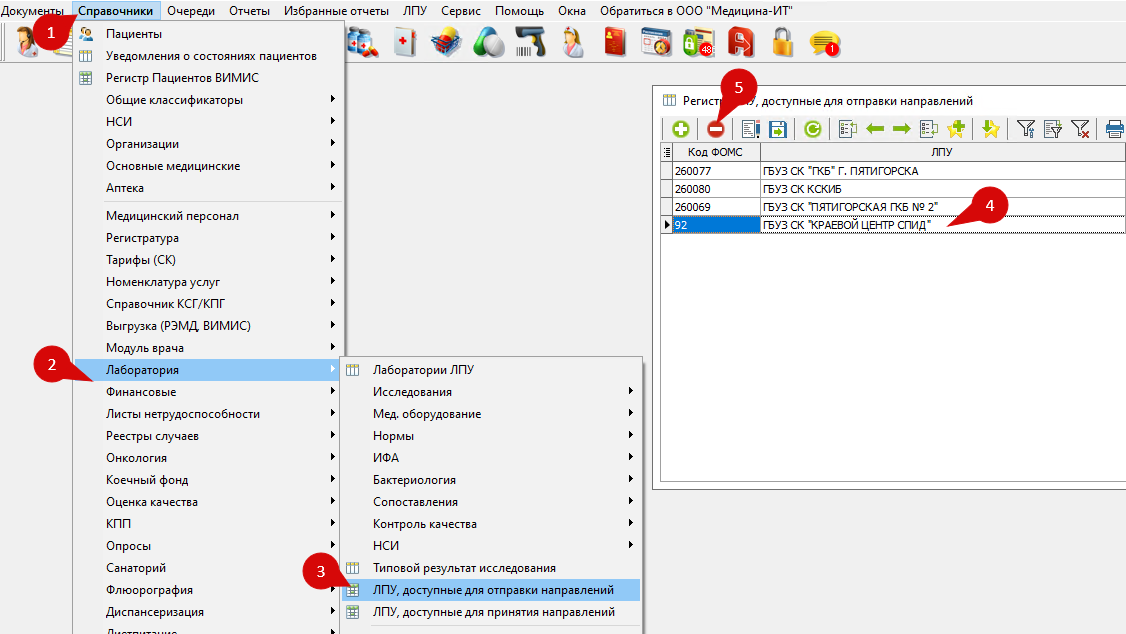 Также, чтобы при выборе организации, список был меньше, так как большинство МО не нужны, можно настроить справочник, чтобы всегда выводился список только с нужными ЛПУ. Для этого перейдите в справочник “ЛПУ, доступные для отправки направлений” Справочники > Лаборатория > Лаборатория ЛПУ, доступные для отправки направлений. (Рисунок 16)