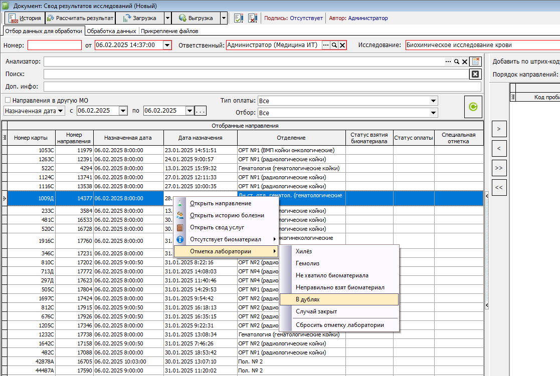 Установить отметку лаборатории можно в журнале направлений (рис. 5) и в своде результатов лабораторных исследований (рис. 6). Для этого на нужном направлении необходимо нажать правой кнопкой мыши, и в появившемся меню выбрать пункт "Отметки лаборатории". В следующем меню можно выбрать отметку.