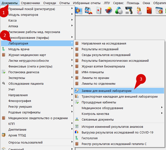Принцип работы с внешними лабораториями в КСАМУ:Создание, редактирование, отправка заявок осуществляется из журнала "Заявки для внешней лаборатории":
