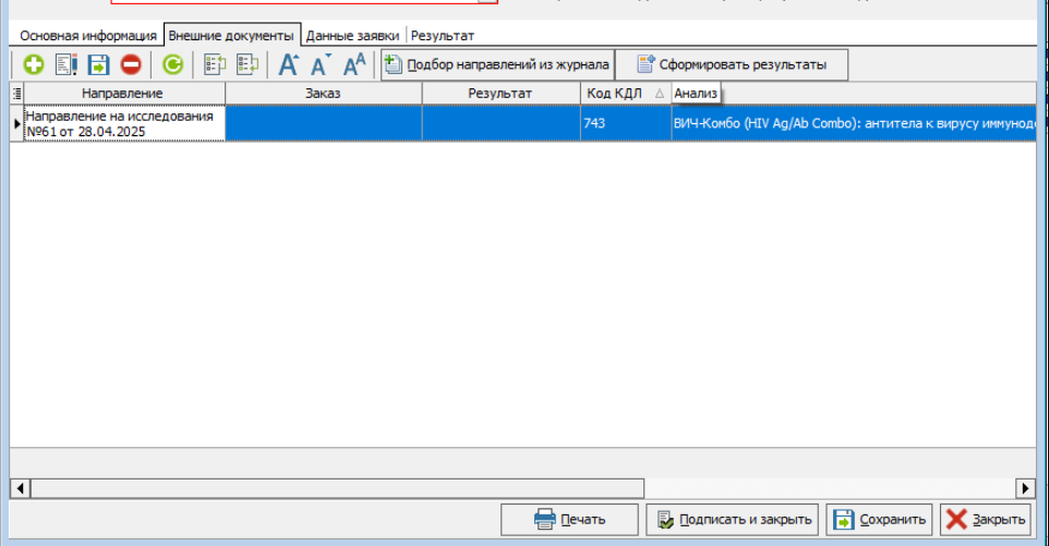 При создании направления на исследования, автоматически создаётся заявка во внешнюю лабораторию. Заявки хранятся в журнале заявок для внешней лаборатории. (Документы – Лаборатория – Заявки для внешней лаборатории).