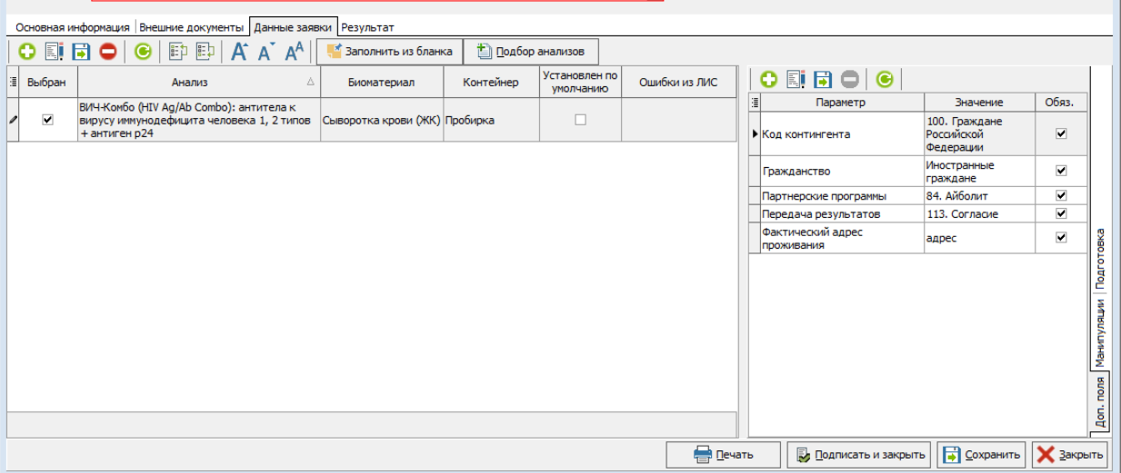 В каждой заявке необходимо проверить корректность заполненных данных, например, проверить выбор биоматериала, контейнера, заполнение кода пробирки если требуется в рамках конкретной интеграции и т.п. Если рабочее место оборудовано принтером этикеток, из заявки можно распечатать этикетки для размещения на контейнере с биоматериалом (Рисунок 10).