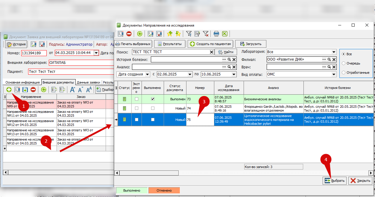 При создании направления на исследования, автоматически создаётся заявка во внешнюю лабораторию. Заявки хранятся в журнале заявок для внешней лаборатории. (Документы – Лаборатория – Заявки для внешней лаборатории).