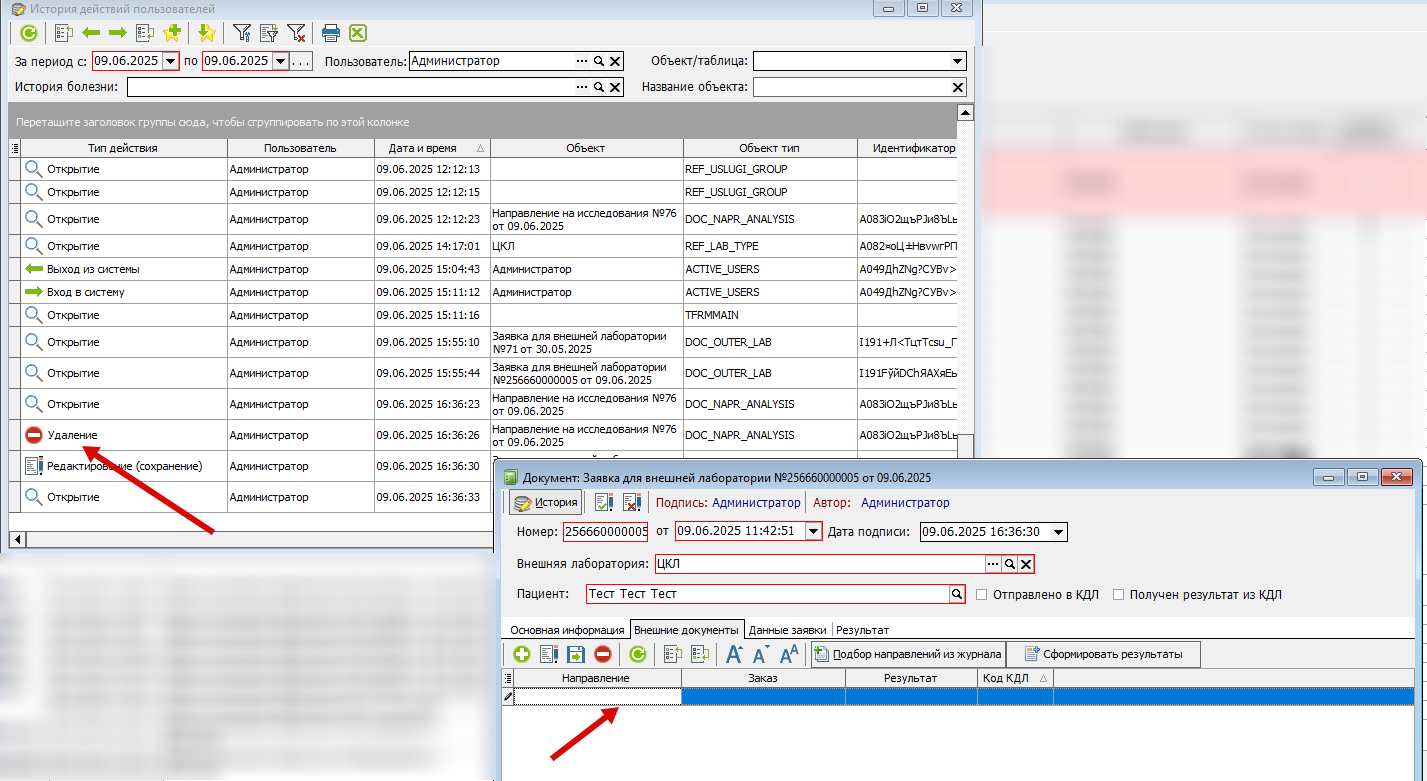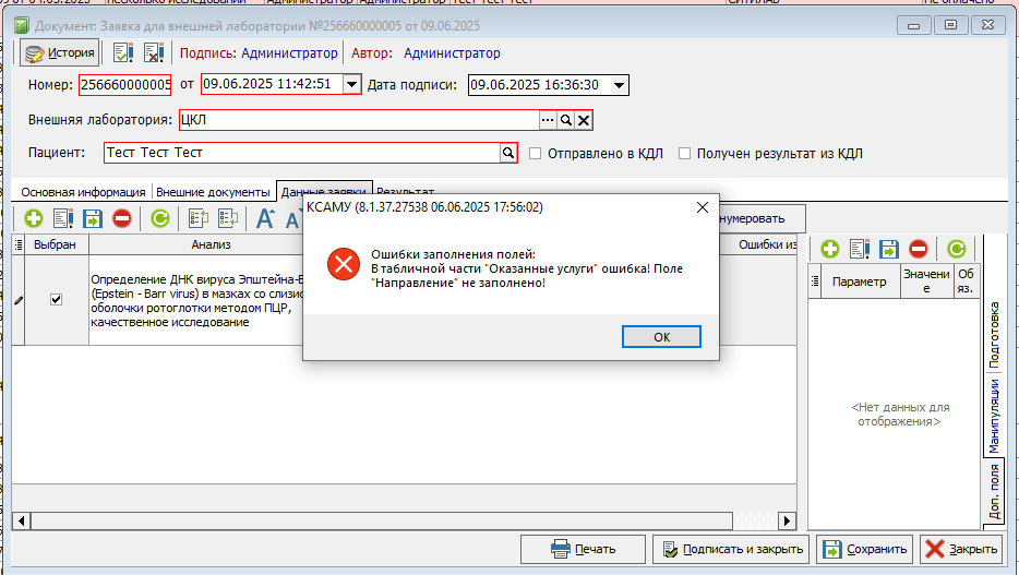 Причина возникновения – удаление документа направления, попавшего в заявку в внешнюю лабораторию.