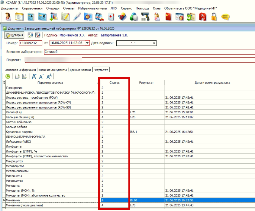 Некоторые анализы выполняются в несколько этапов и при попытке загрузки результатов, в случае, если хотя бы у одного параметра возвращается статус 1 или 2, у заявки не появится признак "Результат загружен", то есть при следующей загрузке результатов запрос будет осуществляться по этой заявке еще раз, пока все параметры не вернутся со статусом не меньше 3.