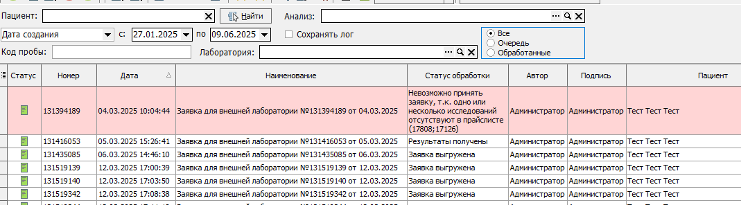 В журнале отображаются: статус отправки заявок, статус обработки и статус получения результата. Так же отображается текст ошибки, при наличии (Рисунок 13). Пояснения о тексте ошибок и статусах обработки следует узнавать у представителей внешней лаборатории.