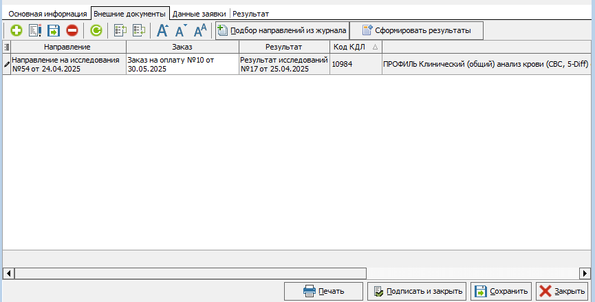 - Внешние документы - отображаются связанные документы по каждому анализу - направление, на основании которого анализ добавлен в заявку, сформированный структурированный результат, если заявка выполнена и загружена, заказ - если направление было создано на основании заказа на оплату: