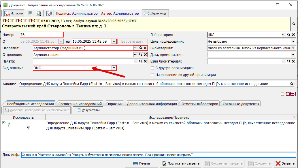 ОМС – оплата выполненного исследования производится из средств ОМС в сторону ЦКЛ.